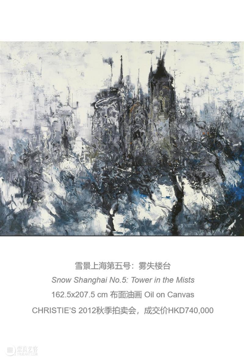 Work Title: Snow Shanghai No.5: Tower in the Mists Medium: Oil on Canvas Dimensions: 162.5×207.5 cm Auction Information: Christie's 2012 Autumn Auction, Transaction Price HKD740,000 Platform Logo: Treasure Art (TREASURE ART)